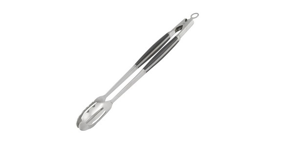 Hochwertige Grillzange mit Verschluss. Mit Griff aus Edelstahl und ABS sowie Lederschlaufe zum Aufhängen. Ergonomischer Griff.