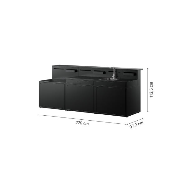 Jedes Modul verfügt über eine Rückwand, die als Wind und Sichtschutz dient und gleichzeitig Platz für die im Lieferumfang enthaltenen Behälter bietet. Optional lässt sich eine Theke montieren, sodass die Küche frei im Raum oder an einer Wand platziert werden kann.
